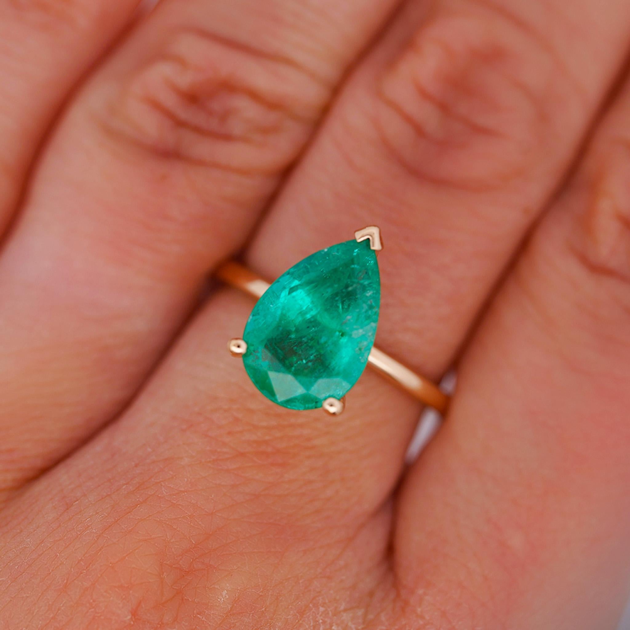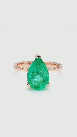 The setting is a sleek and minimal 3-prong open basket in 18K rose gold — one V-prong securing the pointed tip of the pear and two round prongs cradling the base — allowing the emerald's full silhouette to be visible from all sides with maximum light exposure to the stone. The plain high-polish round shank is clean and unadorned, placing every visual emphasis on the large pear emerald center stone without distraction. The warm blush tone of the 18K rose gold creates an exceptionally flattering contrast against the rich cool green of the emerald, a color pairing that feels both modern and romantically distinctive.