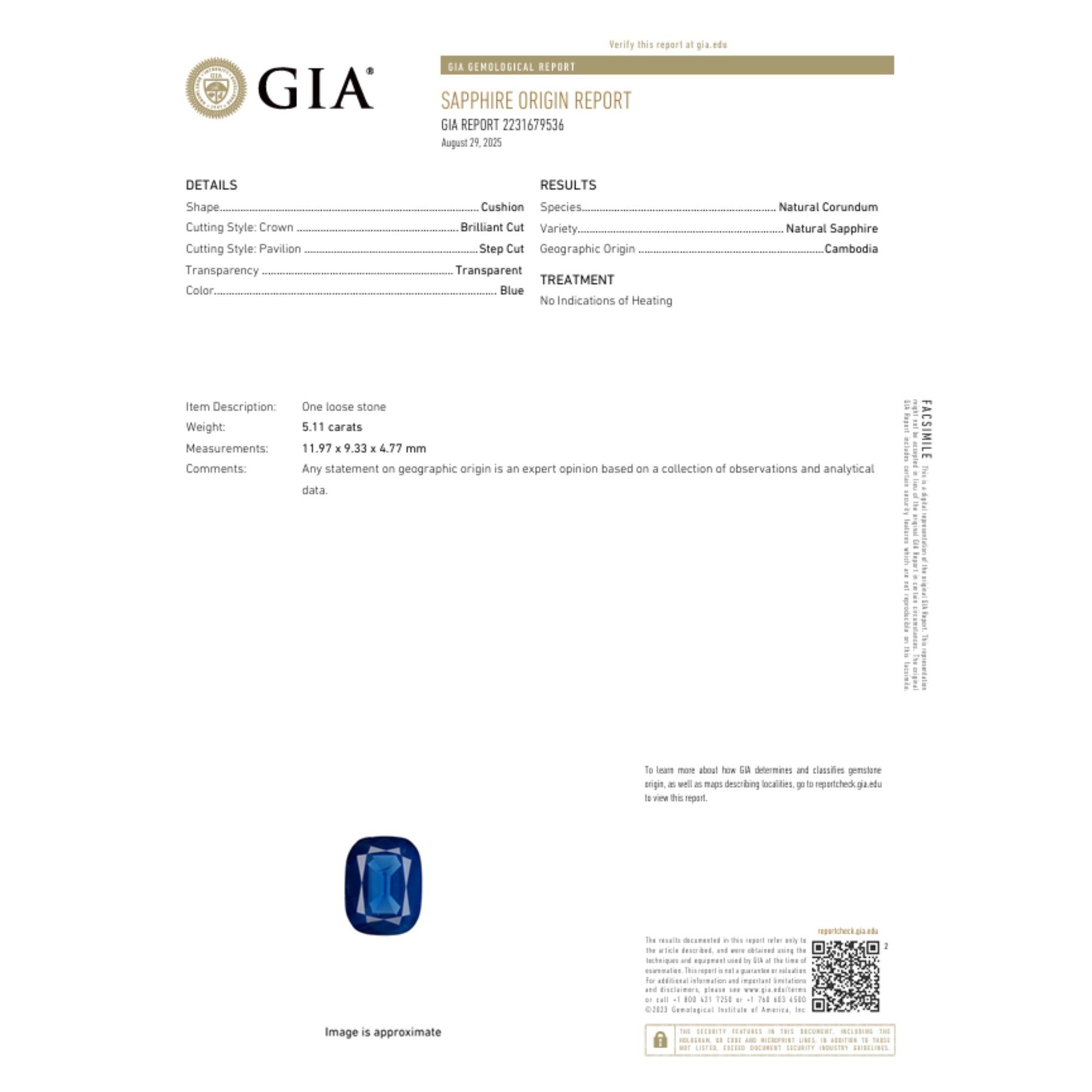 About The Sapphire This 5.11 carat cushion cut sapphire exhibits rich blue color with transparent clarity characteristic of premium Cambodian material. No heat treatment designation confirms the color occurs naturally without thermal enhancement, significantly increasing value and desirability. Measuring 11.97 x 9.33 x 4.77mm, the stone delivers impressive visual presence with excellent face-up appearance. Mixed cut combines brilliant faceting on the crown with step cut pavilion optimizing both brilliance and color saturation. GIA certification provides comprehensive authentication and quality documentation from the world's most respected gemological laboratory.