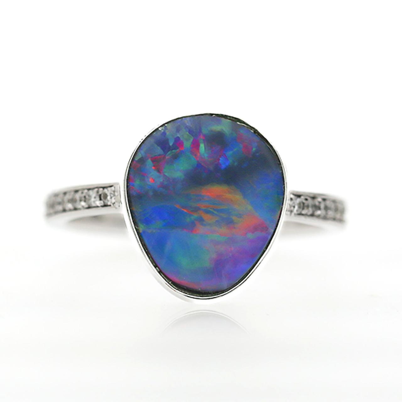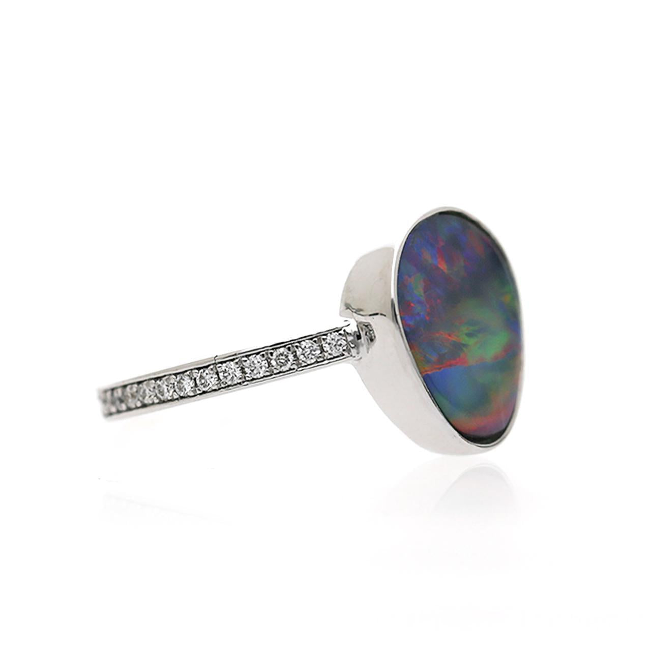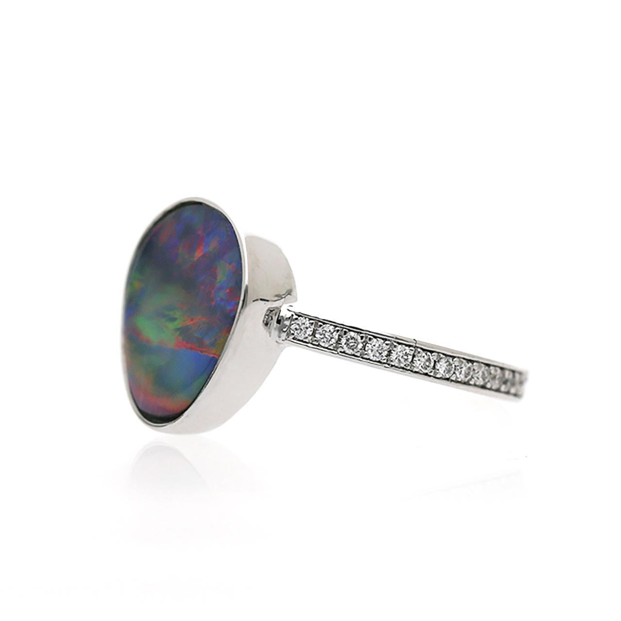 Opale noire naturelle de 2,70 carat, sertie en bezel libre-forme, et Bague cocktail en or blanc 18K pavée de diamants ronds brillants de 0,26 carat, mettant en valeur un jeu de couleurs vif et complet sur sa silhouette ორგანique avec une fine tige sertie de diamants.