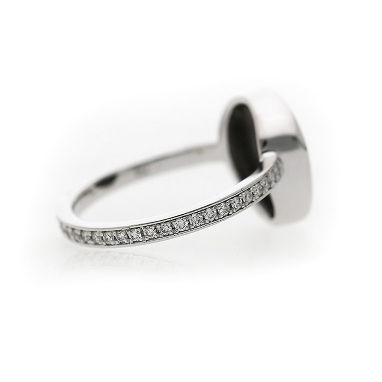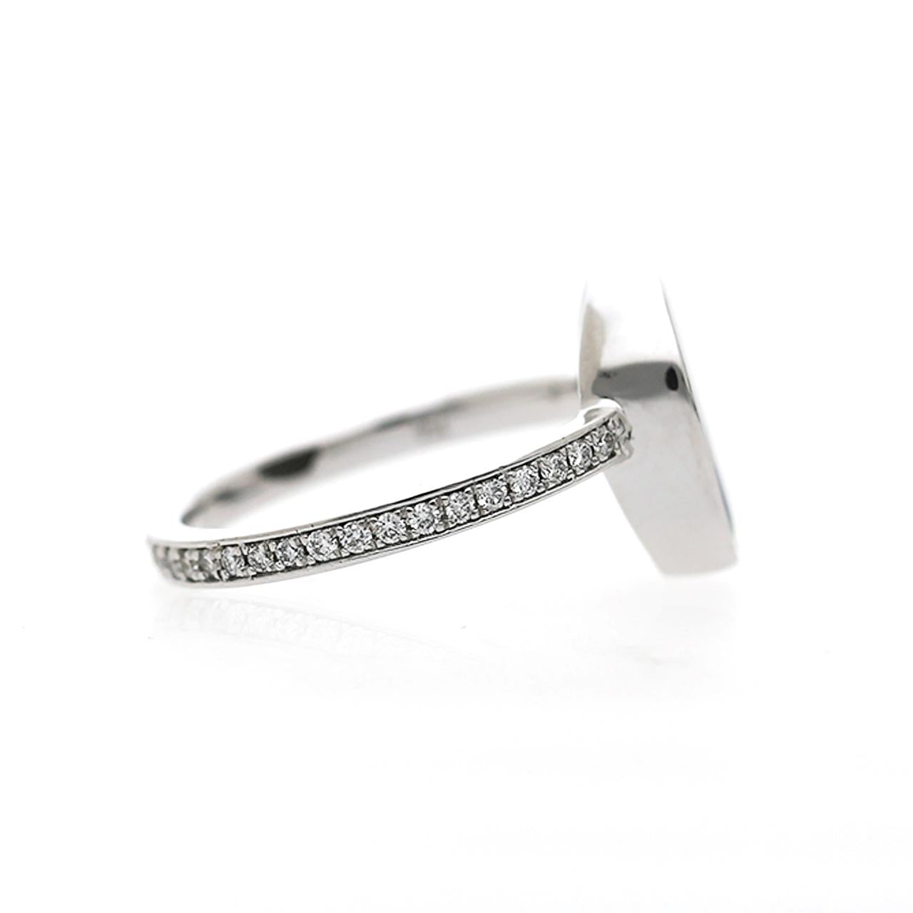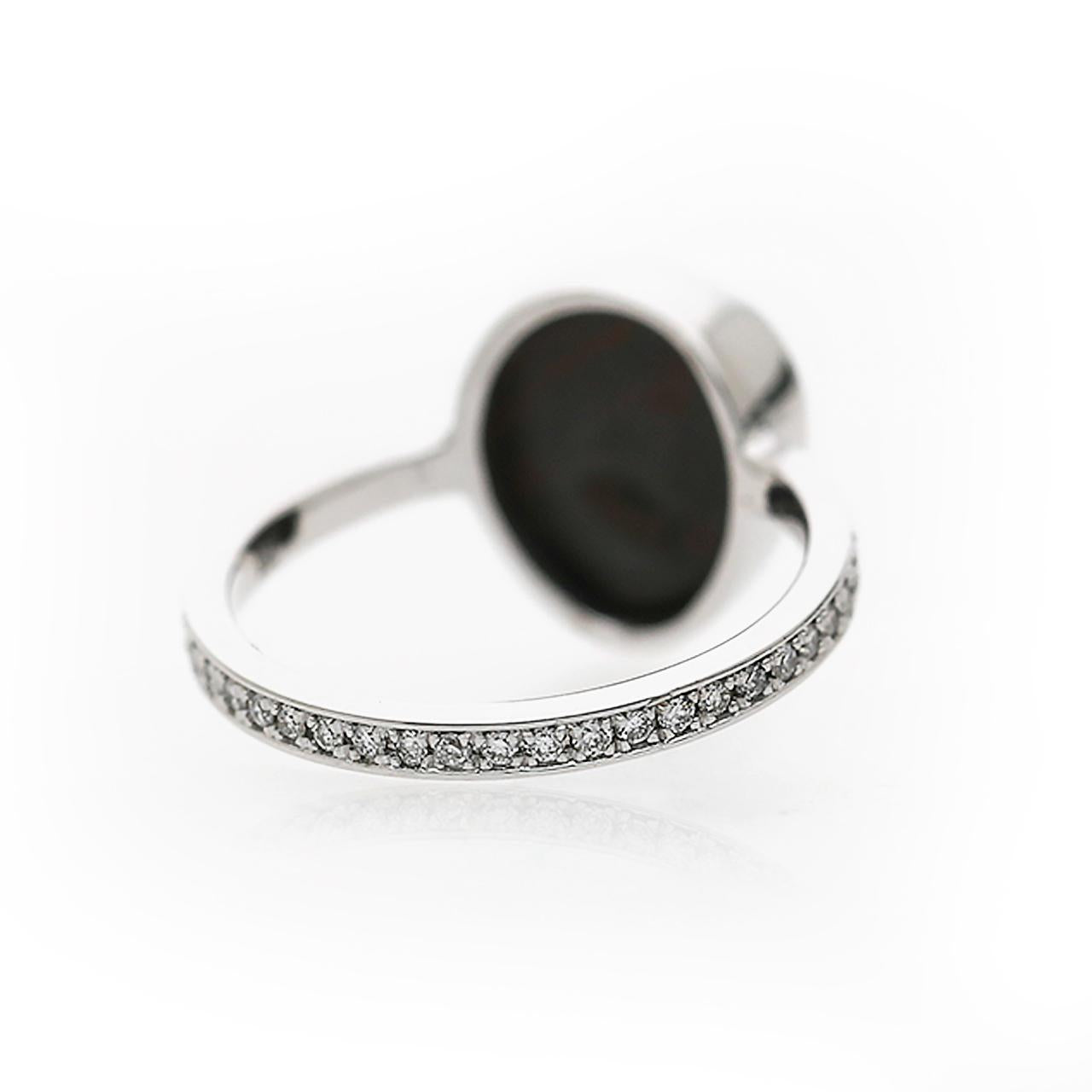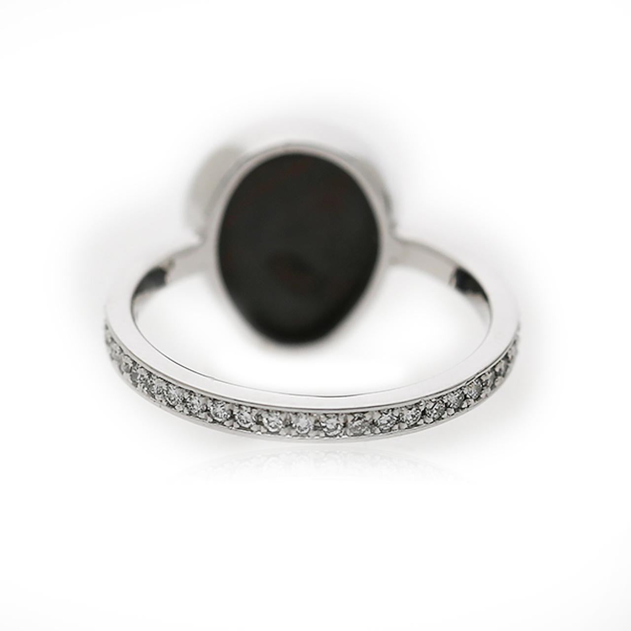 Le sertissage est un modèle d’élégance minimaliste — un bezel complet, net et discret, en or blanc 18K, enveloppe l’opale noire libre-forme dans une monture argentée sans couture qui laisse la silhouette naturelle irrégulière de la pierre s’exprimer pleinement. La fine tige en or blanc est sertie de 37 diamants ronds brillants en une ligne pavée continue des deux côtés, ajoutant un éclat délicat qui guide le regard vers le spectaculaire centre en opale, sans lui faire concurrence. La philosophie générale du design repose sur la retenue et l’assurance — laisser l’une des pierres précieuses les plus extraordinaires de la nature être l’unique point focal.