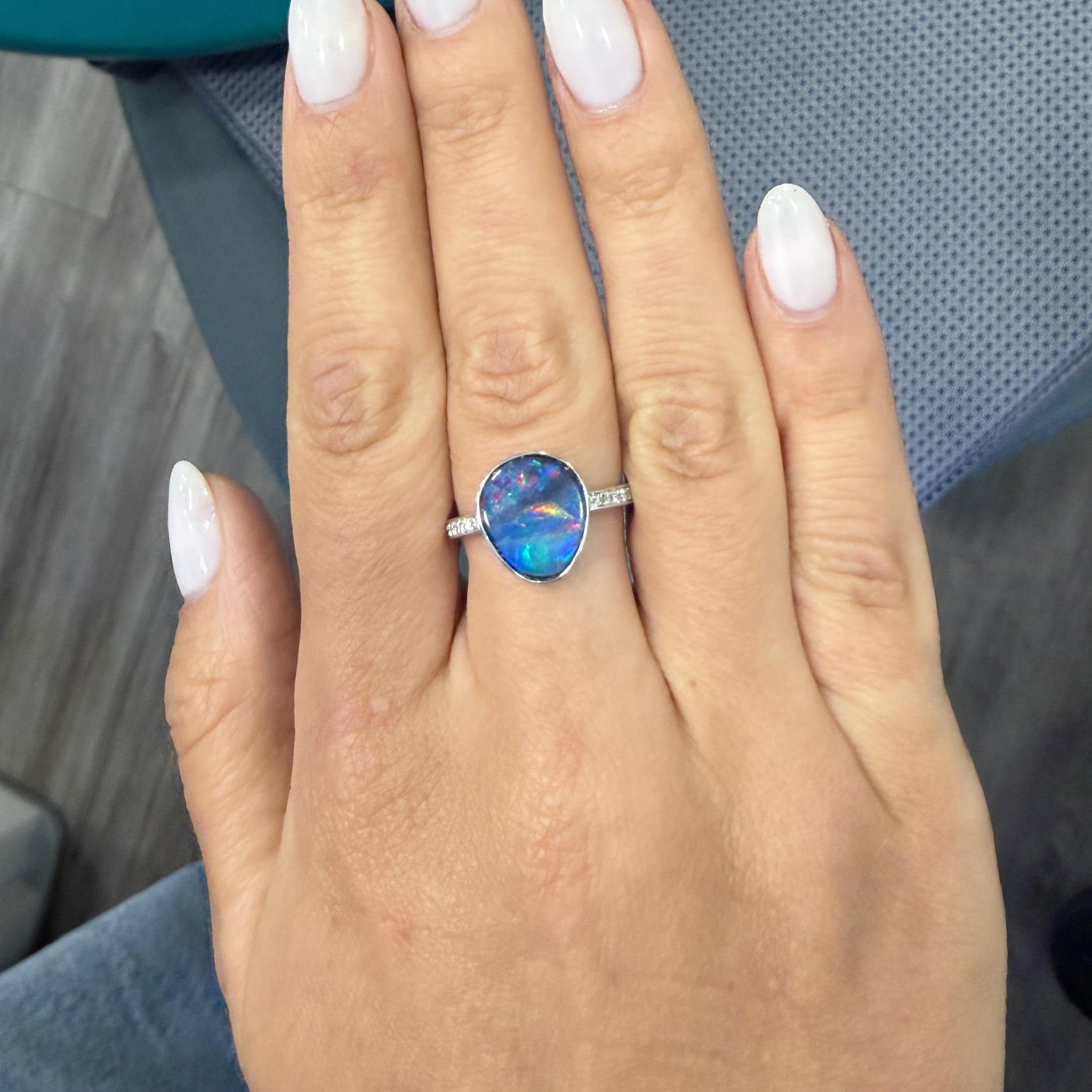 Bague en or blanc 18K sertie clos, opale noire 2.70 carat, forme libre