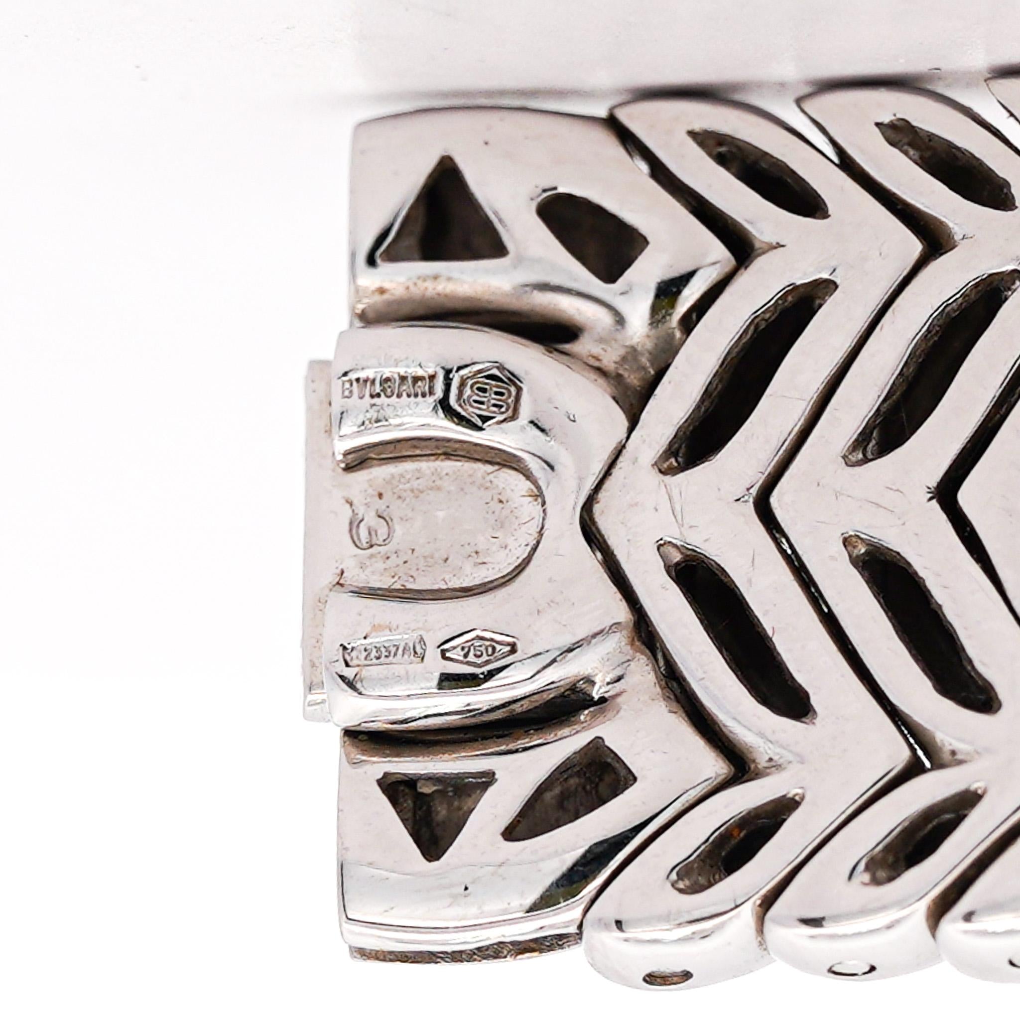 Original Bvlgari Trika quartz watch in 18K white gold featuring a 21.50mm square case with diamond-set dial and integral link bracelet. Set full and single-cut diamonds totaling approximately 1.35 carats (D-E-F color /VS1-VS2 clarity). Weighing 129 grams, 6.75 inch length with concealed clasp and double-safety catch.